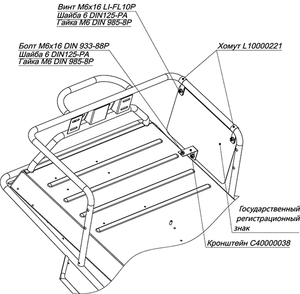 Государственный регистрационный знак необходимо крепить сбоку на левой стороне снегохода в его задней части параллельно продольной плоскости симметрии. Детали крепления номерного знака поставляются в комплекте со снегоходом.