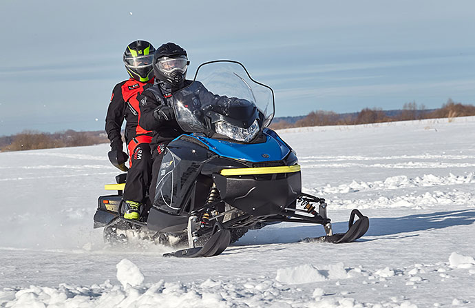 Снегоход энергономичен: перед поездкой можно легко отрегулировать высоту руля и жесткость подвески. Тепла и комфорта добавят подогрев рукояток и курка газа, розетки для обогрева визеров на шлемах водителя и пассажира. Ручки для пассажира оснащены ветро-защитой и подогревом. Возможность за счет съемного модульного сидения увеличить багажное пространство. Приборная панель оптимально информативна для дальней поездки — все это делает «Фронтьер 1000» идеальным снежным крузером.